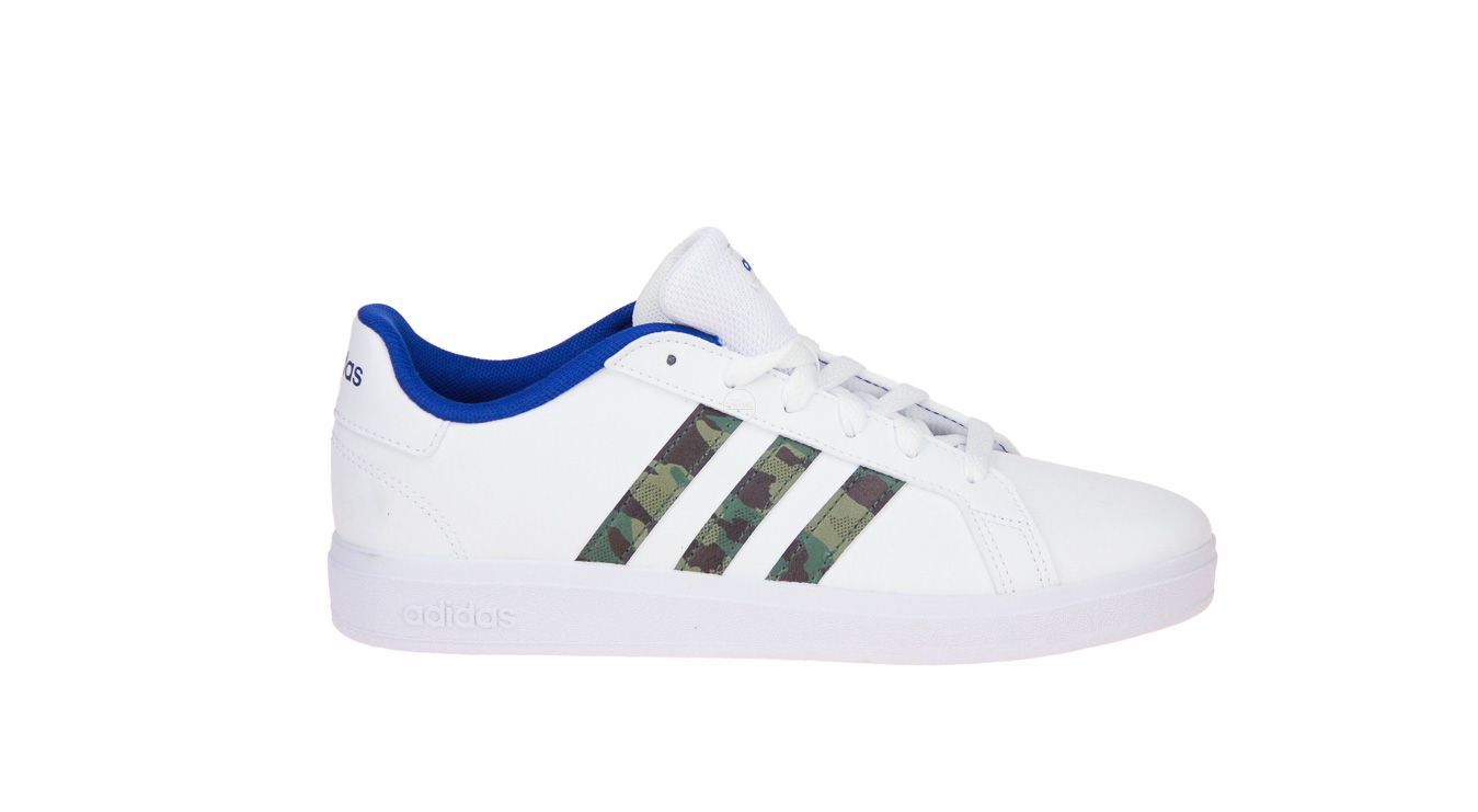 Wit synthetisch lederen sneaker met legerprint als accent van het merk Adidas.