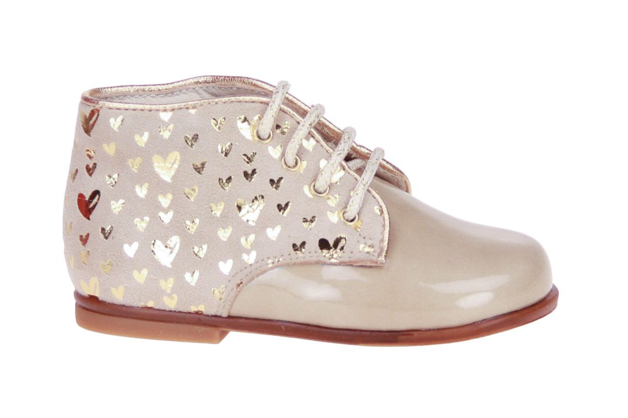Beige laklederen meisjesschoentje van het merk Beberlis. Het schoentje is afgewerkt met suède hartjes.