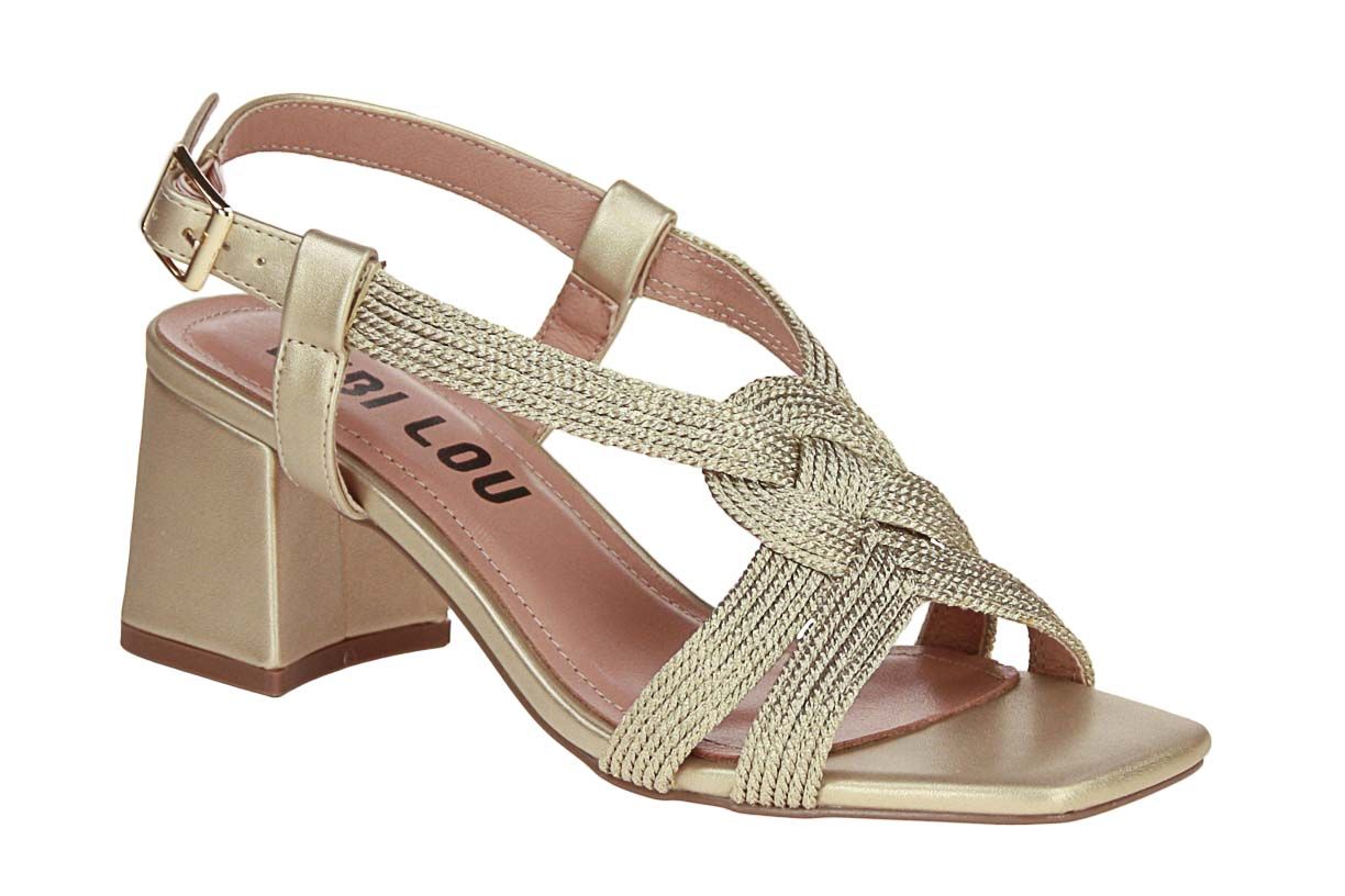 Deze goud lederen damessandaal is van het merk Bibi Lou.