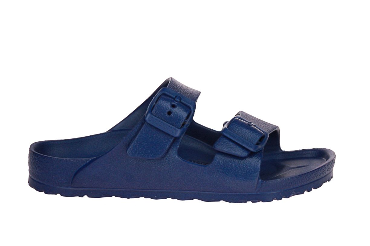 Blauw rubberen kinderslipper van het merk Birkenstock.