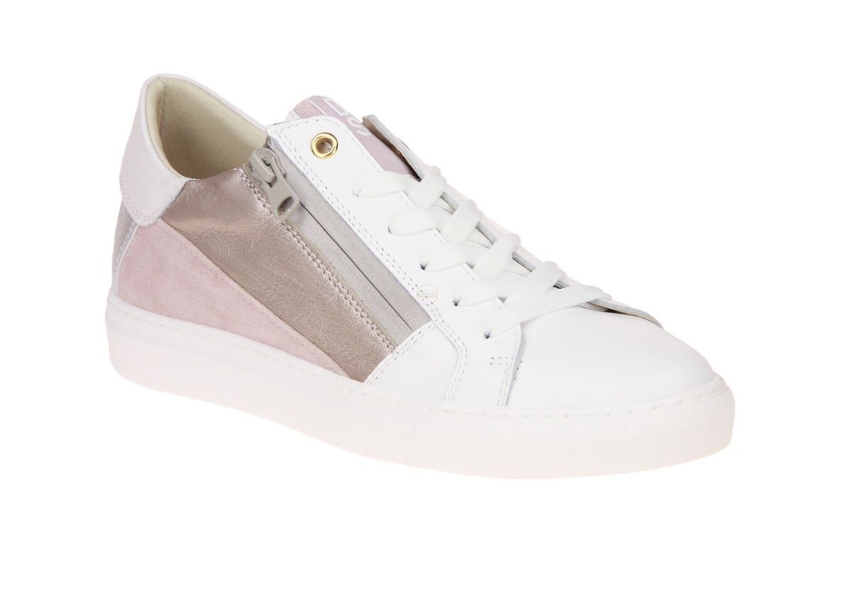 Wit lederen damesschoen met roze accenten van het merk DL Sport. De binnenzool is uitneembaar, ideaal voor steunzolen.