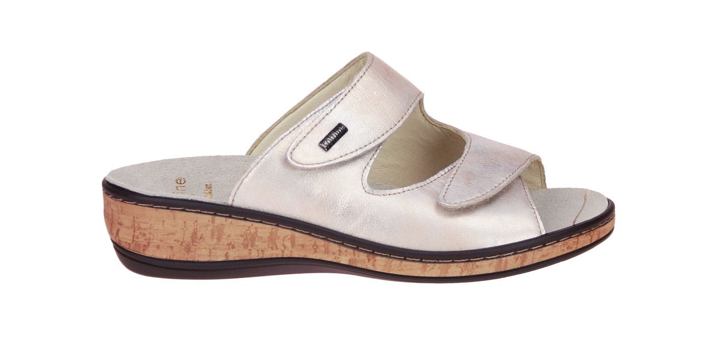 Beige metallic lederen damesslipper van het merk Fidelio. De binnenzool is uitneembaar, ideaal voor steunzolen.
