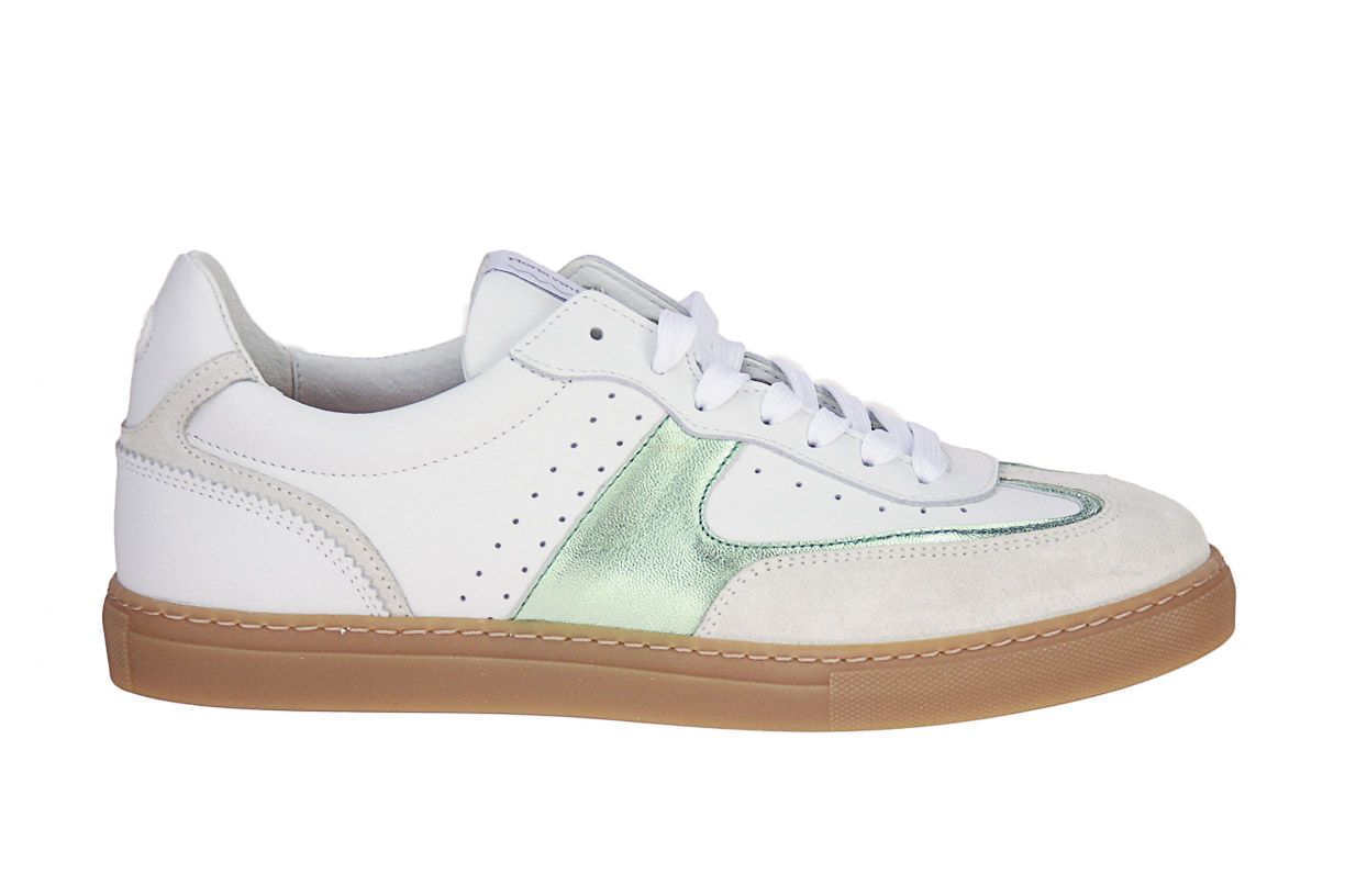 Wit lederen damesschoen met muntgroene accenten van het merk Floris van Bommel. De binnenzool is uitneembaar, ideaal voor steunzolen.