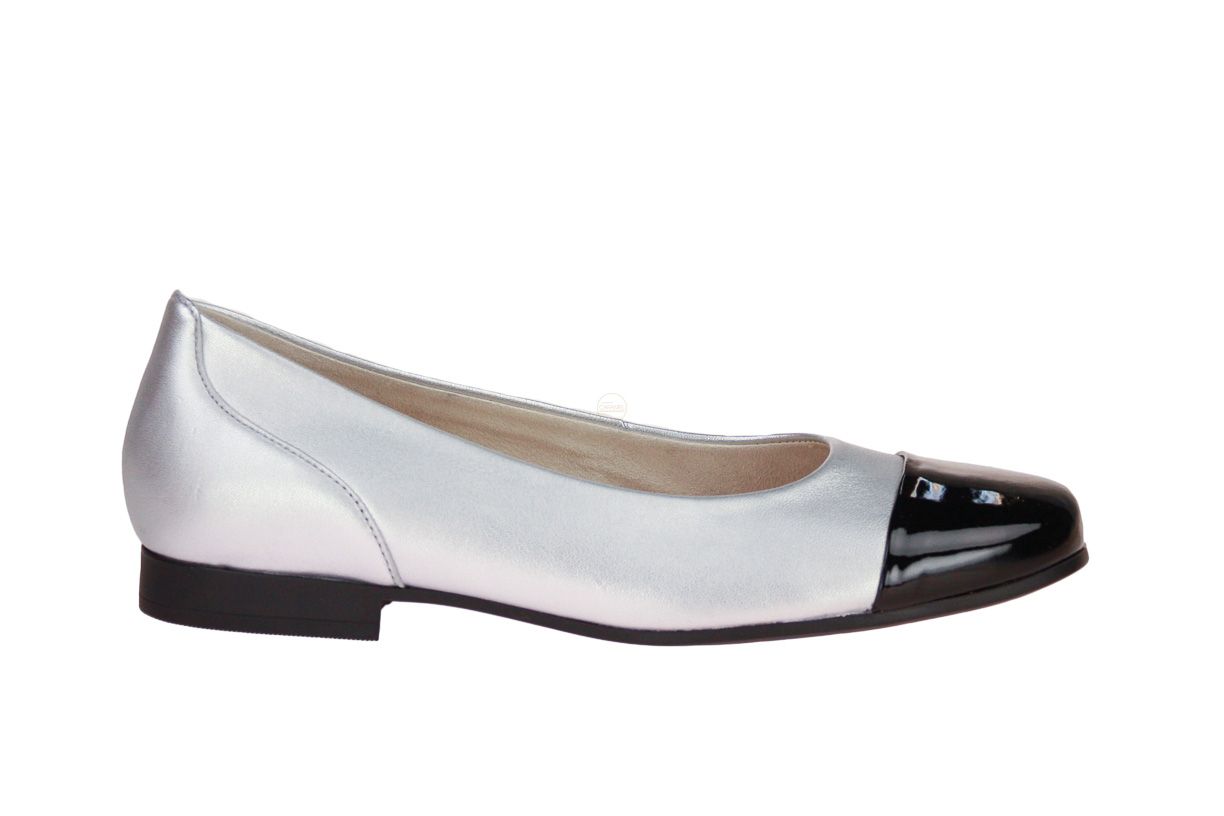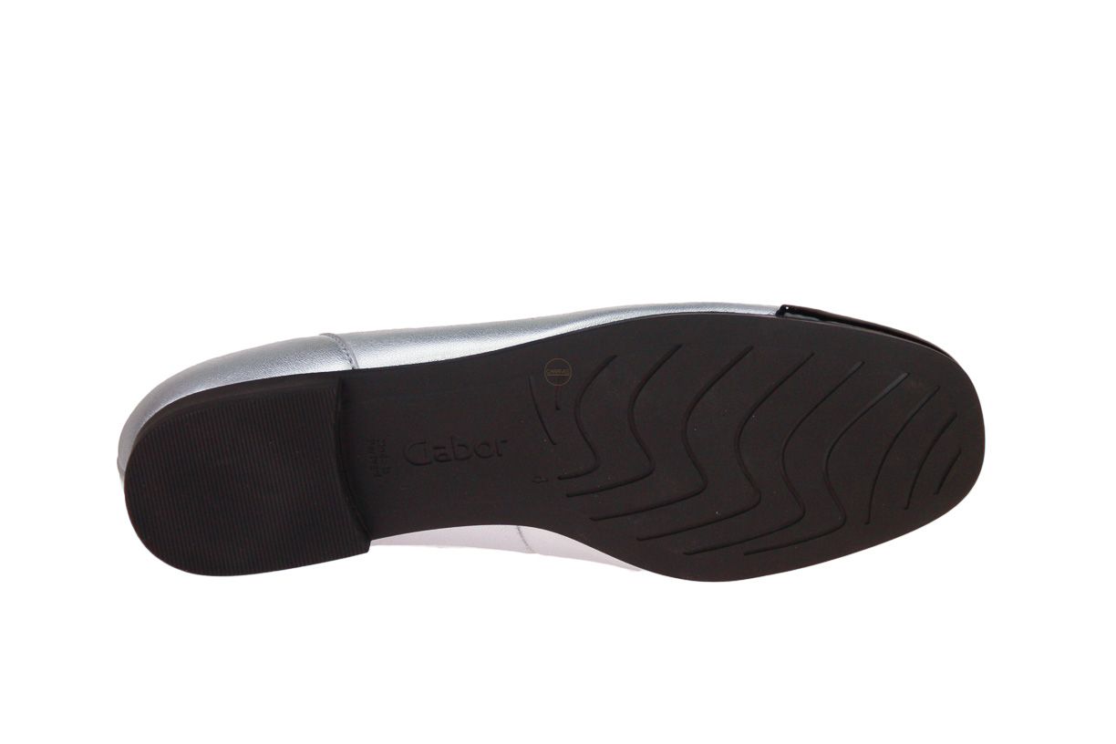 Zilver lederen damesschoen van het merk Gabor. De neus van de schoen is afgewerkt in het lak zwart.