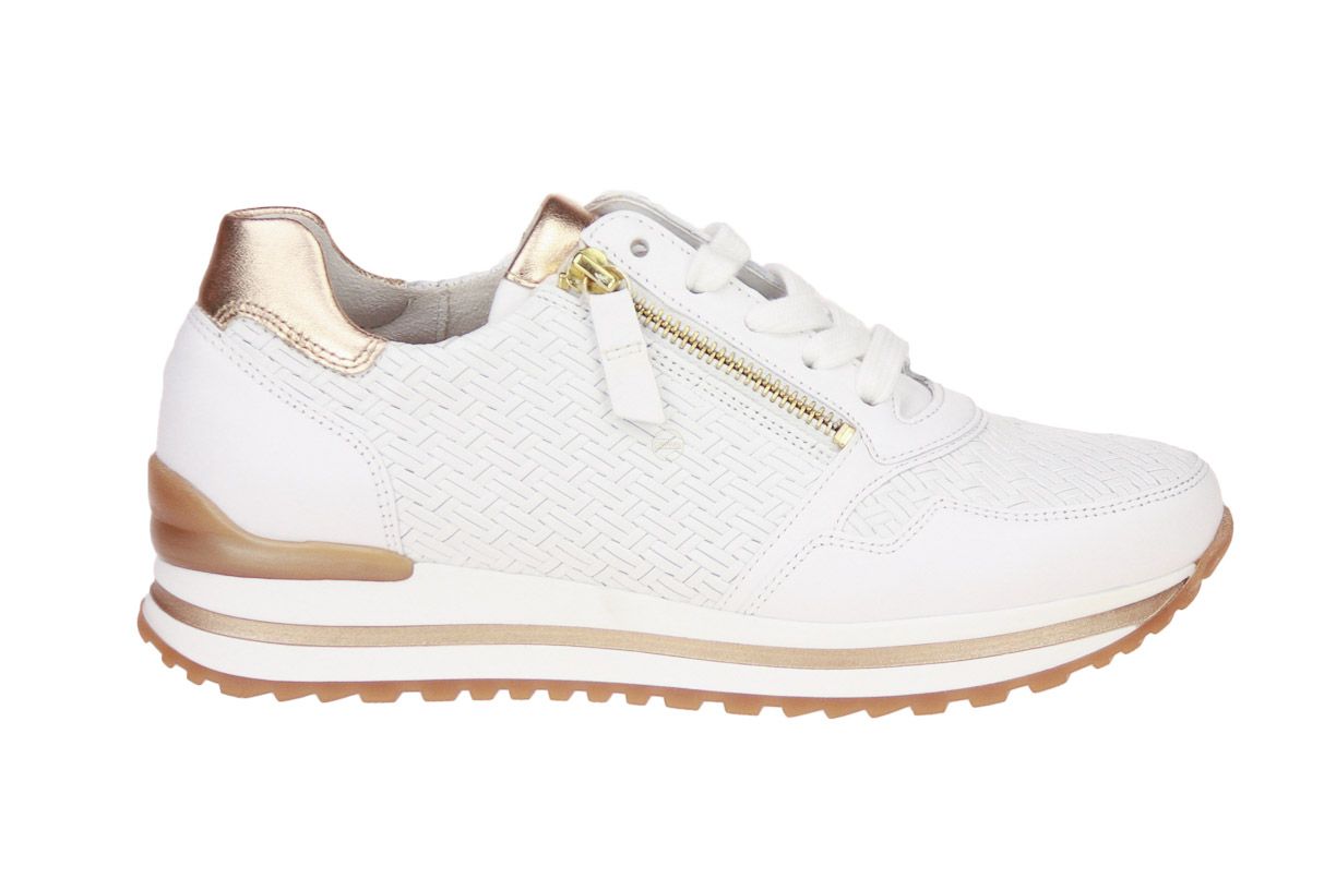 Wit lederen damesschoen met roze metallic accenten van het merk Gabor. De binnenzool is uitneembaar, ideaal voor steunzolen.