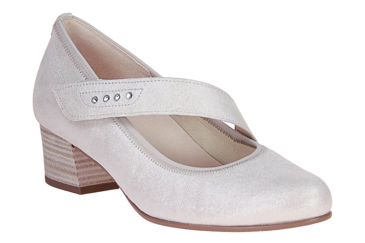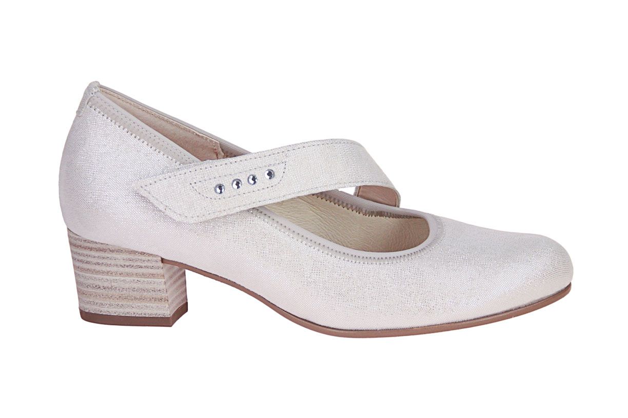Wit metallic nubuck damesschoen van het merk Gabor. Dit model heeft een uitneembare zool, ideaal voor steunzolen.