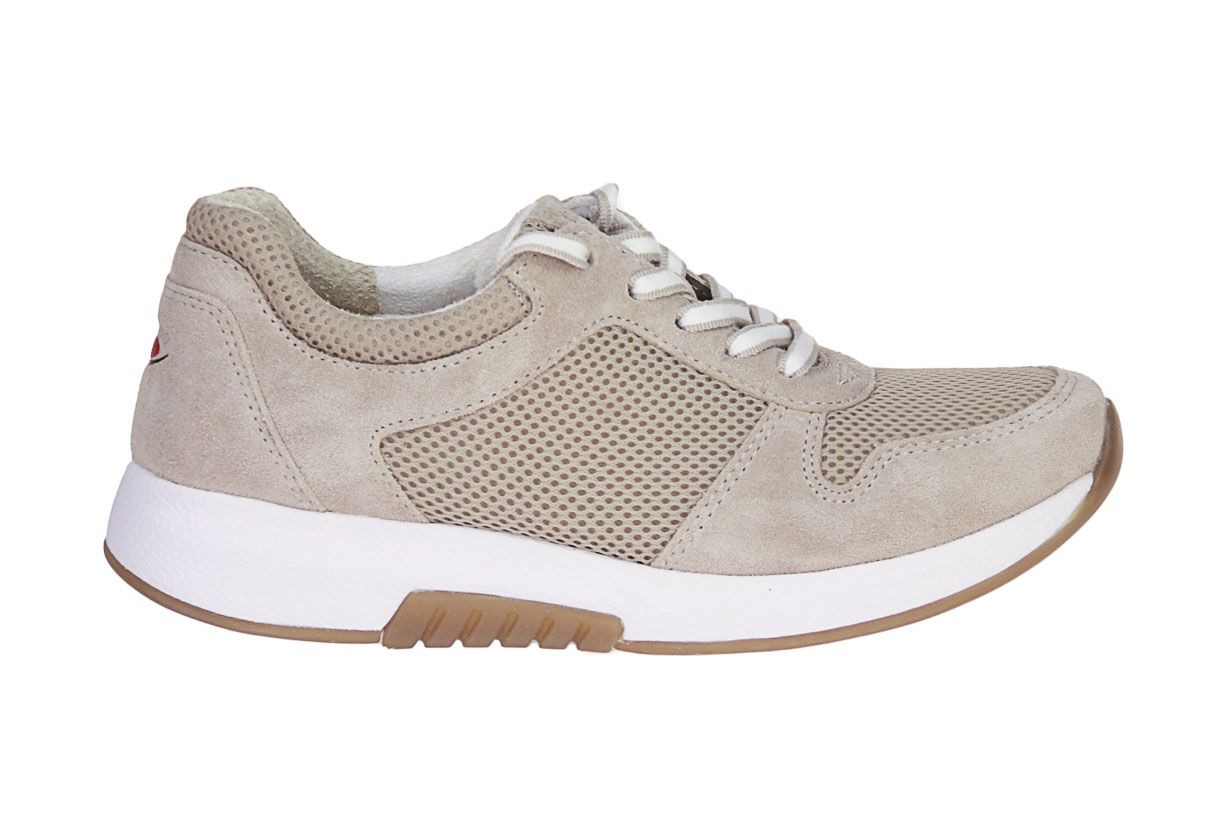 Beige suède damesschoen van het merk Gabor Rollingsoft. De binnenzool is uitneembaar, ideaal voor steunzolen.