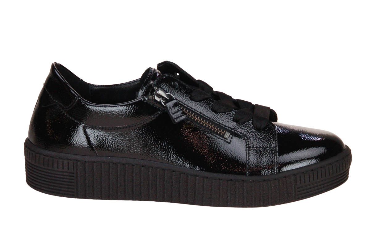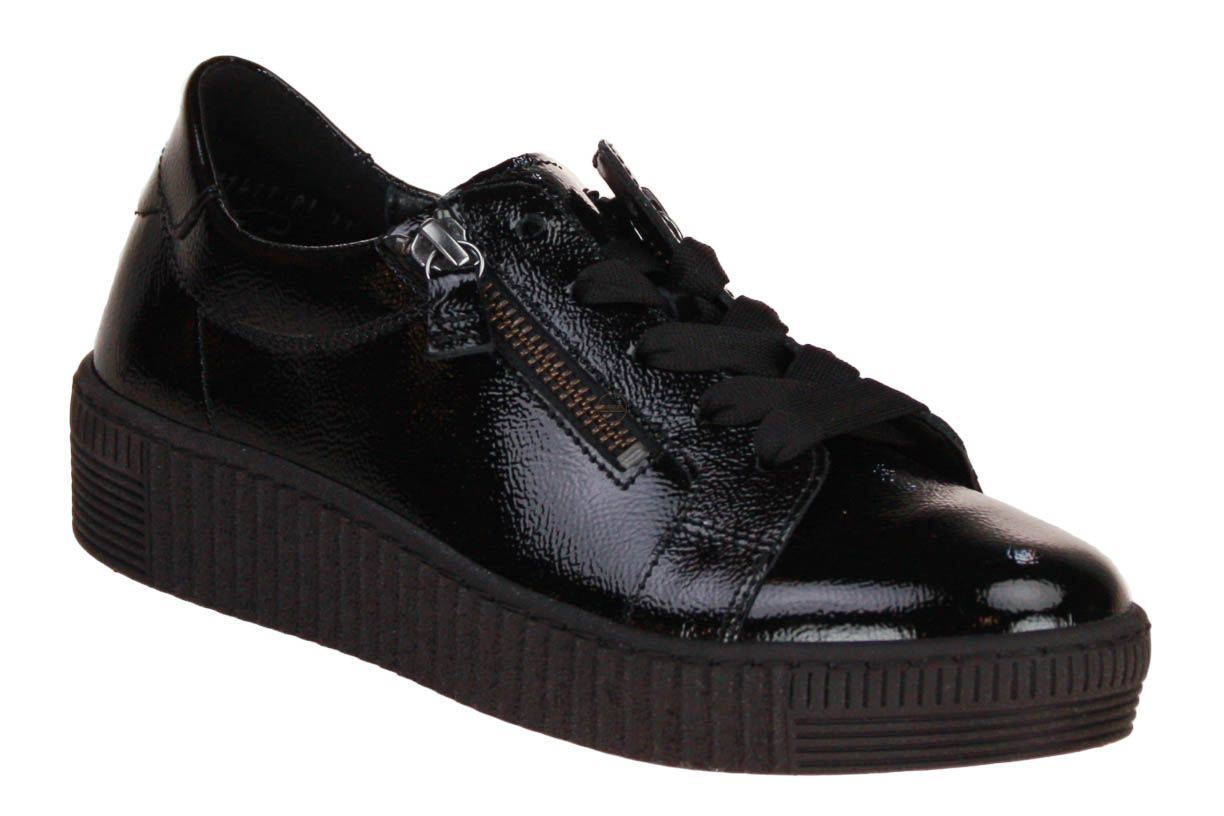 Deze zwart laklederen damesschoen is van het merk Gabor. De binnenzool is uitneembaar, ideaal voor steunzolen.