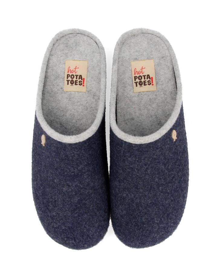 Blauw wollen herenpantoffel van het merk Hot Potatoes. De binnenzool is uitneembaar, ideaal voor steunzolen.