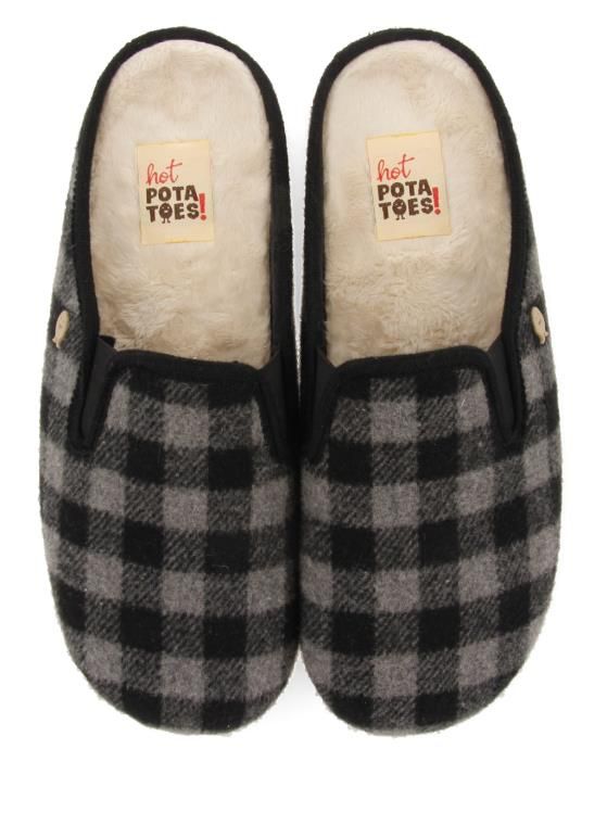 Grijs wollen herenpantoffel van het merk Hot Potatoes. De binnenzool is uitneembaar, ideaal voor steunzolen.
