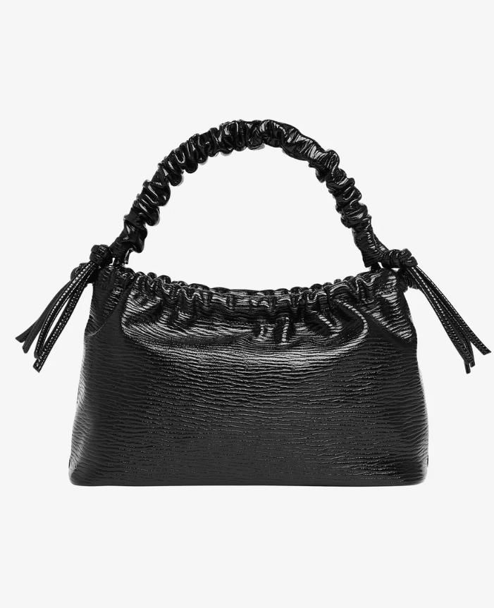 Shoulder bag with wrinkled detailing on the handle, string details and zip closure. It contains one main compartment with two small inner pockets and one zip pocket. It comes with an attachable crossbody strap.