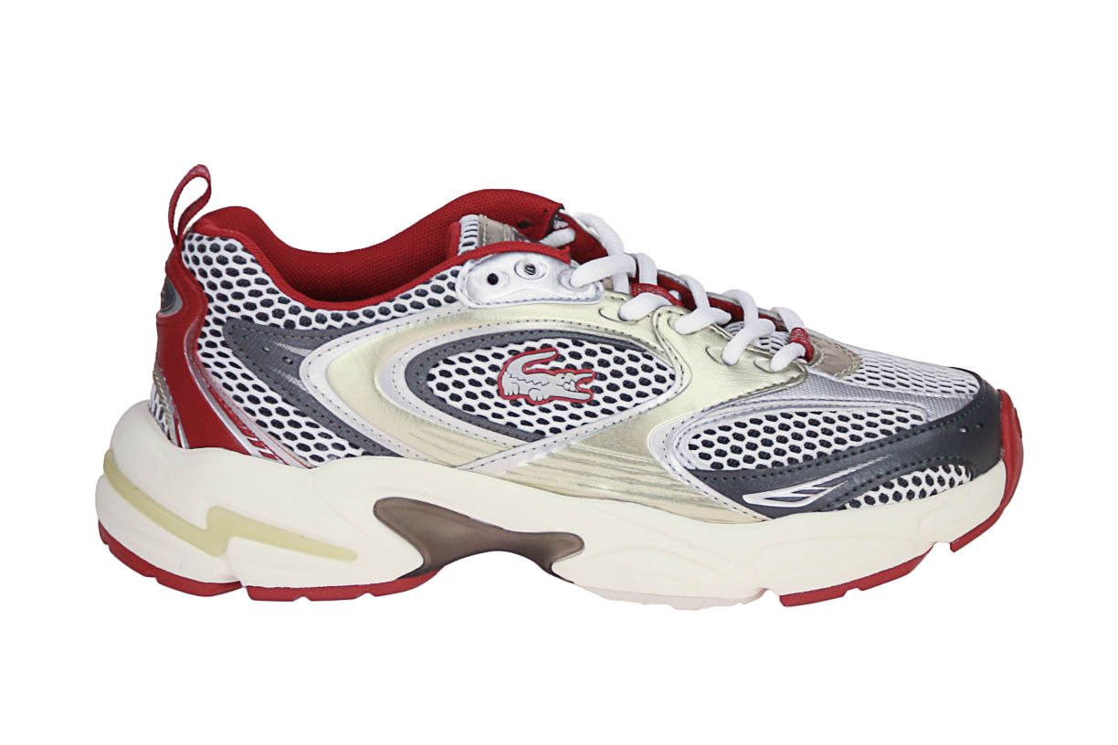 Deze rood textielen damesschoen is van het merk Lacoste.