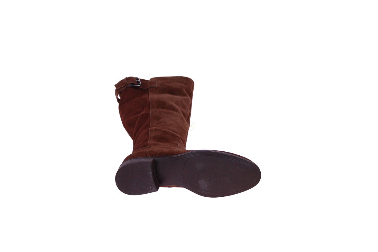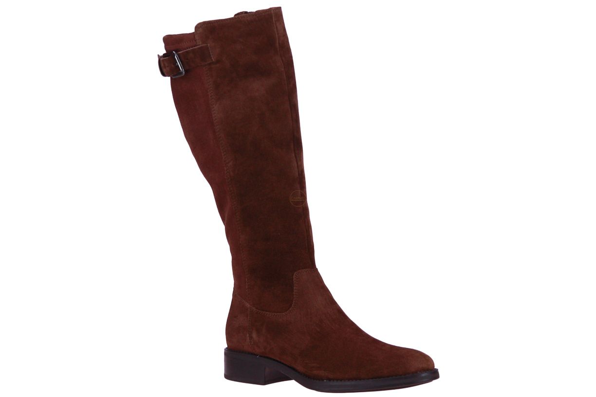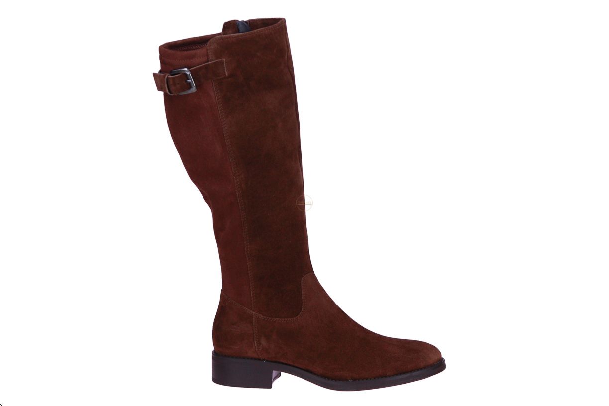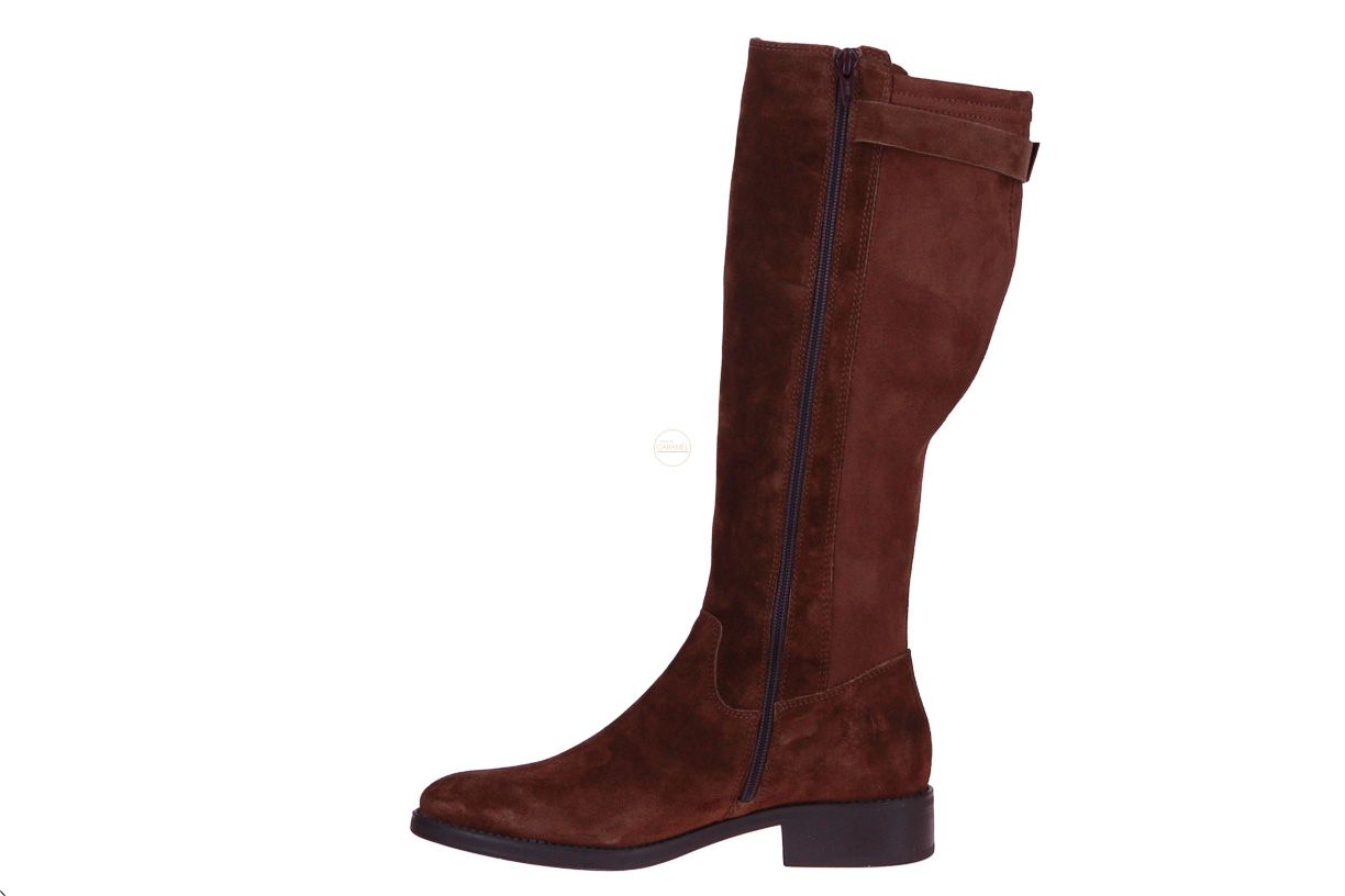 Cognac suède lange dameslaars van het merk Lamica. De laars is bovenaan afgewerkt met een gesp.