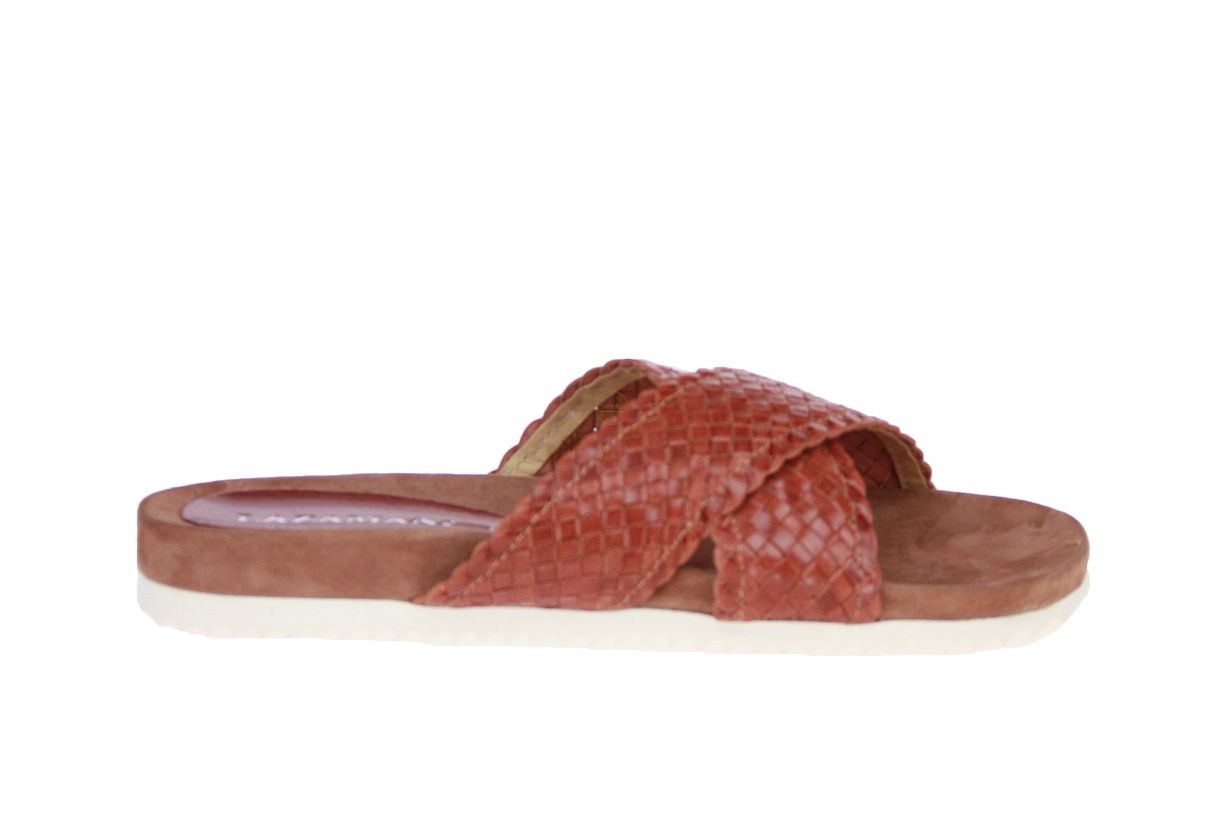 Cognac lederen damesslipper van het merk Lazamani.