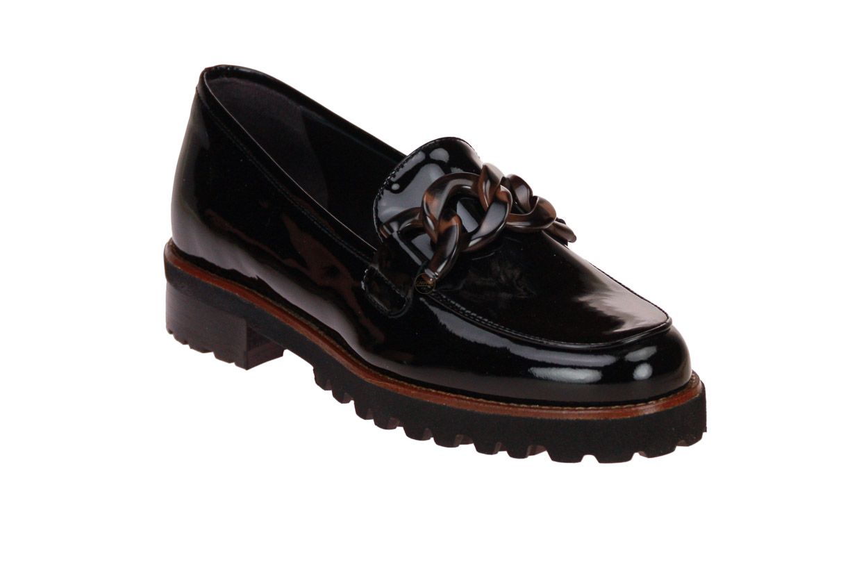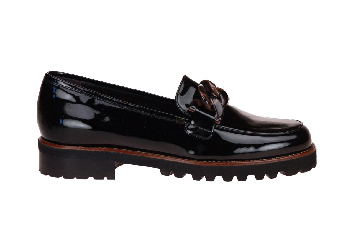 Zwart laklederen damesschoen van het Italiaanse merk Luca Grossi. De schoen is afgewerkt met bruine accenten.