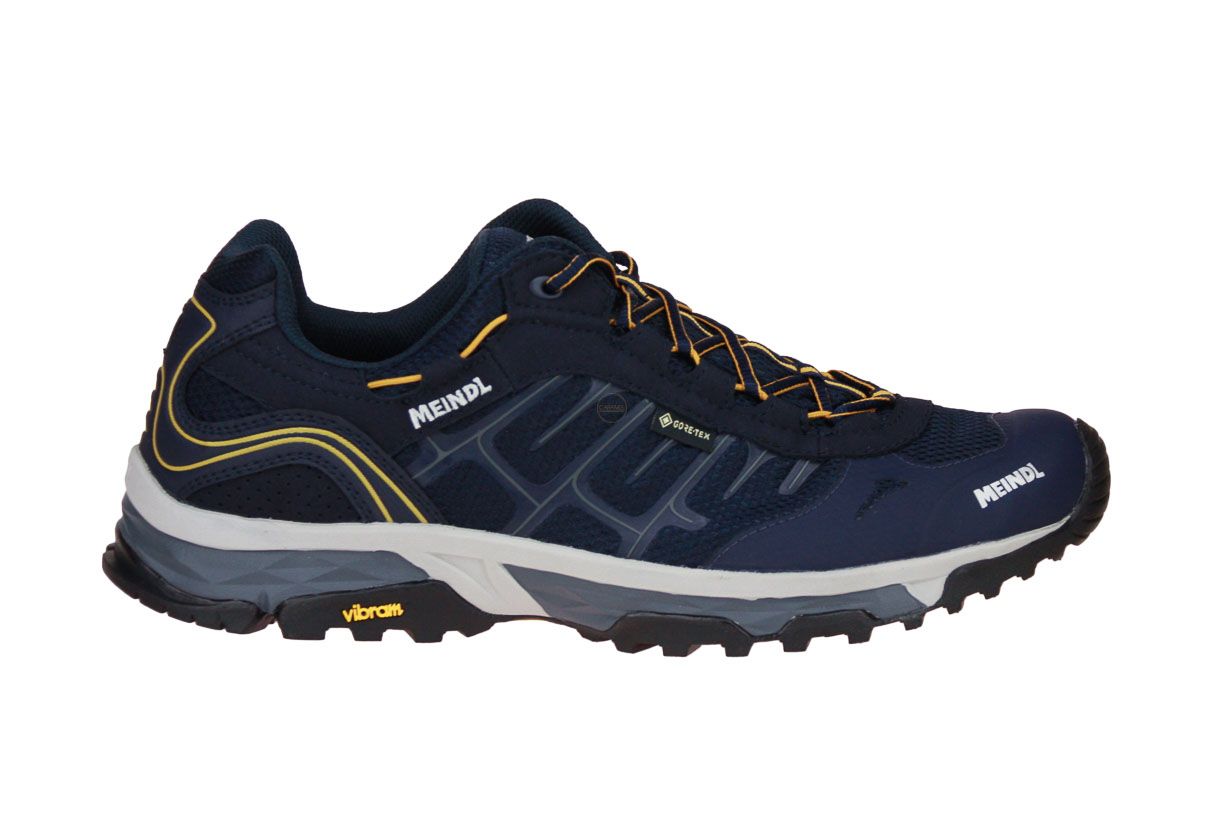 Blauw gore-tex lage wandelschoen voor heren van het merk Meindl. De binnenzool is uitneembaar, ideaal voor steunzolen.