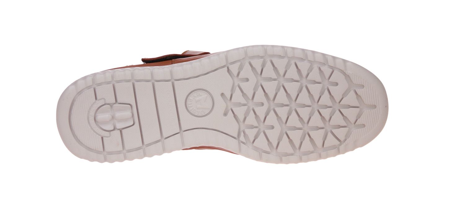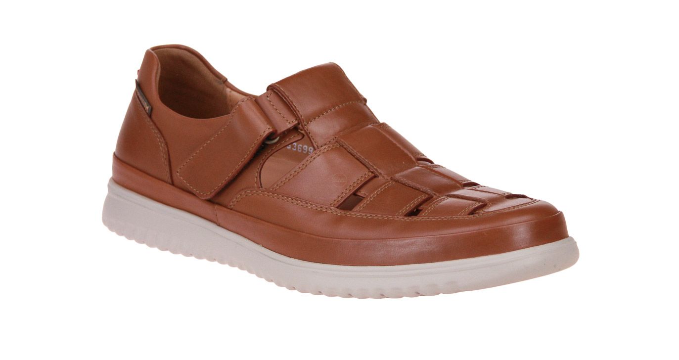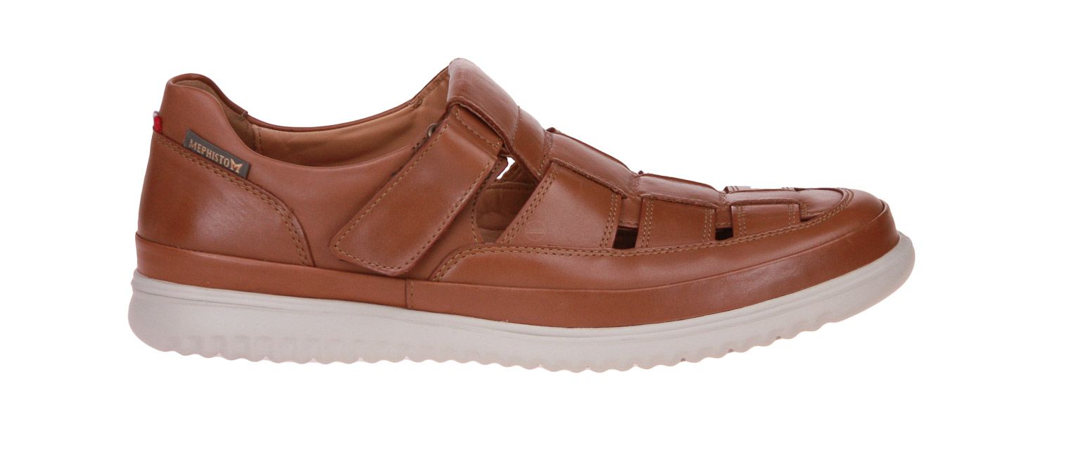 Cognac lederen herensandaal van het merk Mephisto. De binnenzool is uitneembaar, ideaal voor steunzolen.
