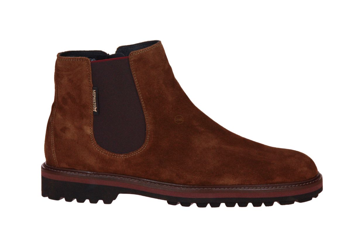 Cognac suède korte herenlaars van het merk Mephisto. De binnenzool is uitneembaar, ideaal voor steunzolen.