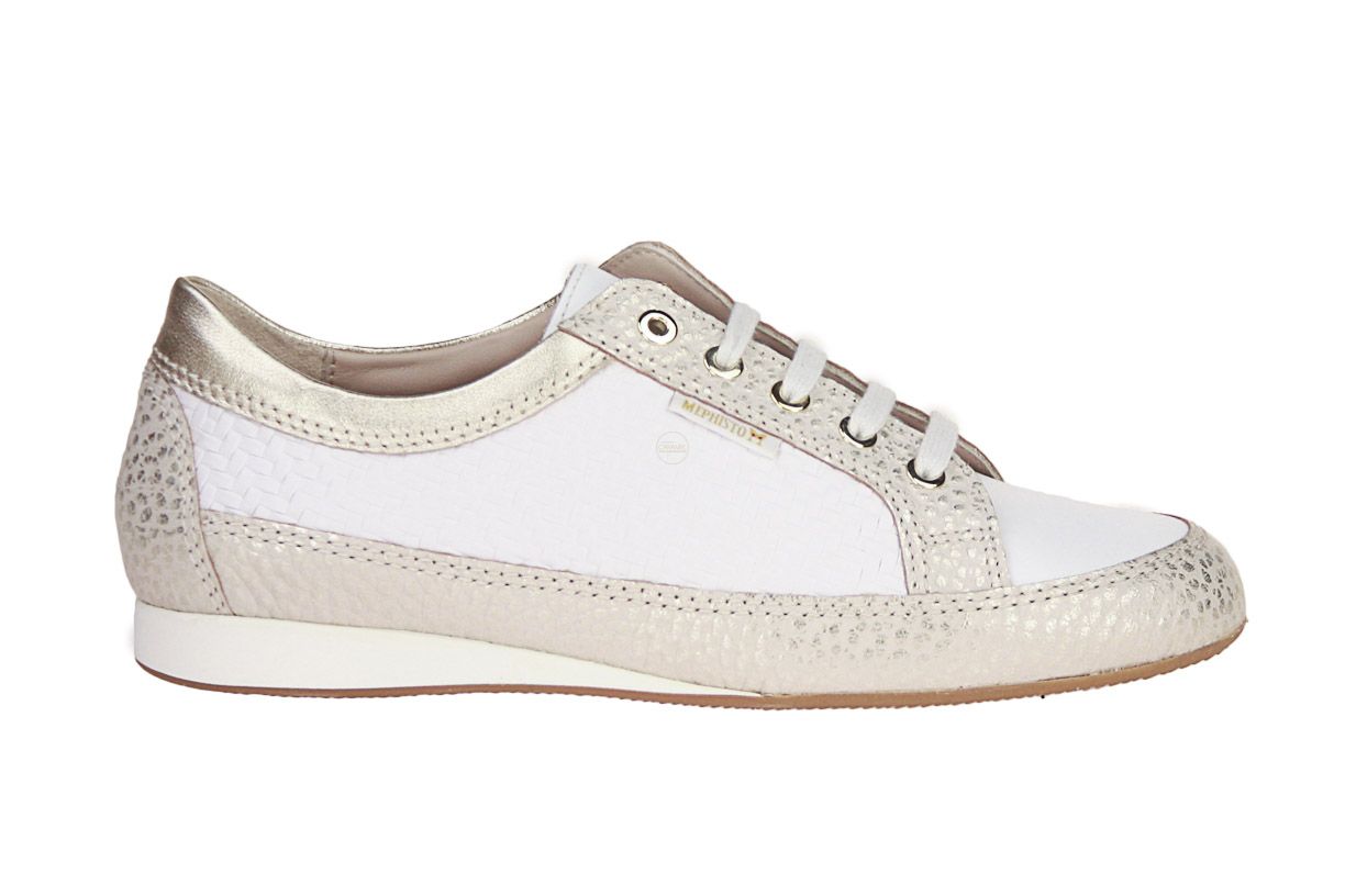 Wit lederen damesschoen met beige accenten van het merk Mephisto. De binnenzool is uitneembaar, ideaal voor steunzolen.