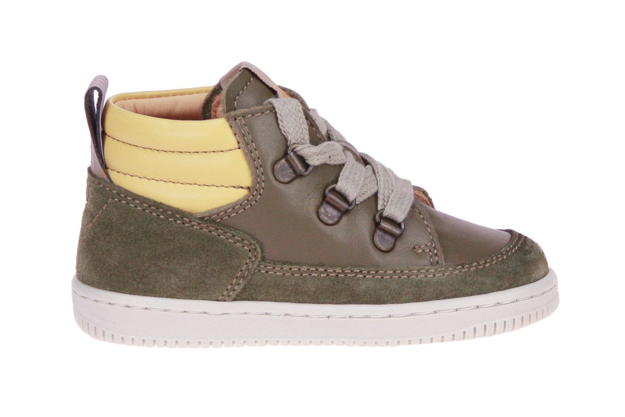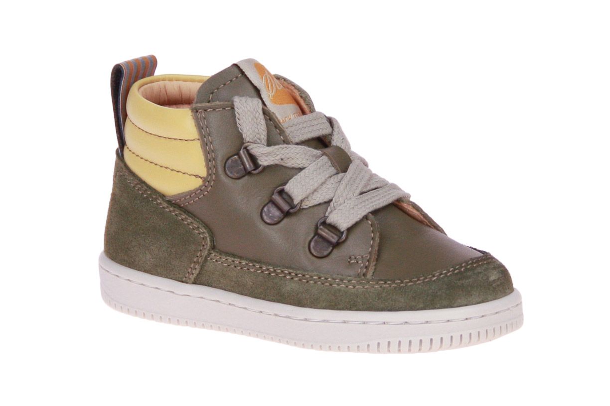 Groen lederen jongensschoen met suède en geel lederen accenten van het merk Ocra. De binnenzool is uitneembaar, ideaal voor steunzolen.