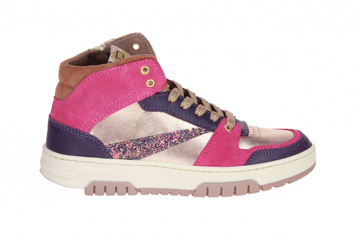 Roze metallic lederen meisjesschoen met roze suède accenten van het merk Poldino. De binnenzool is uitneembaar, ideaal voor steunzolen.