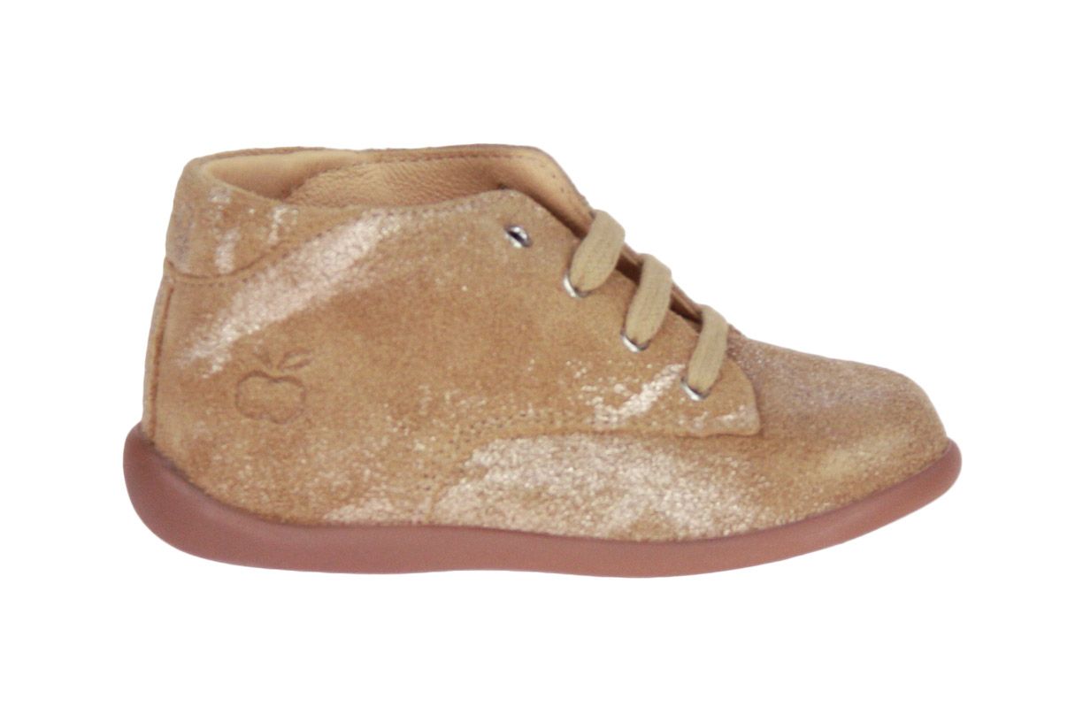 Beige/gouden suède meisjesscheon van het merk Pom d'Api. Dit schoentje is ideaal om te leren stappen.