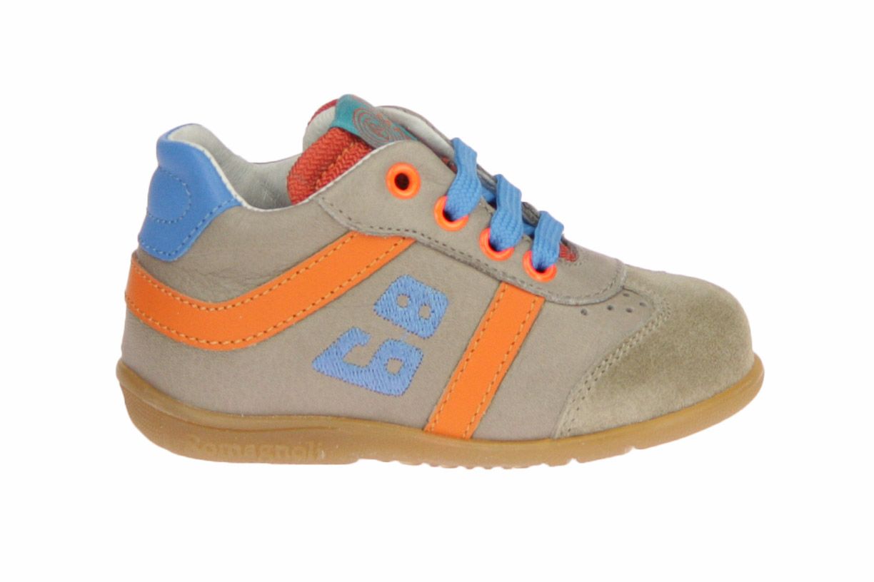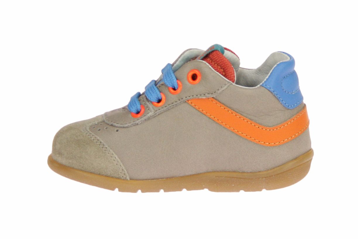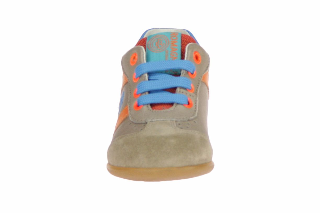 Grijs lederen schoentje van het merk Romganoli. De schoen is afgewerkt met blauwe en oranje accenten. Bestel online - gratis levering