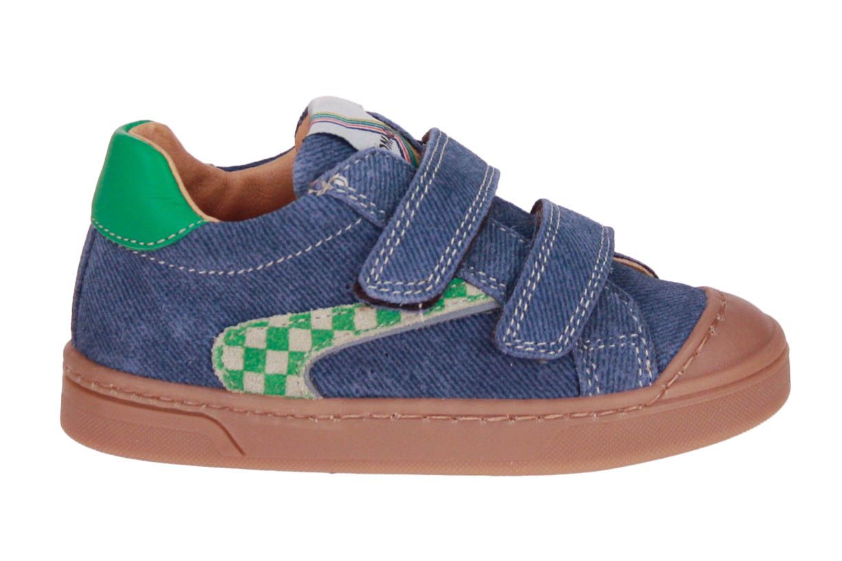 Deze blauw suède jongensschoen is van het merk Romagnoli. De sneaker is afgewerkt met groene accenten.