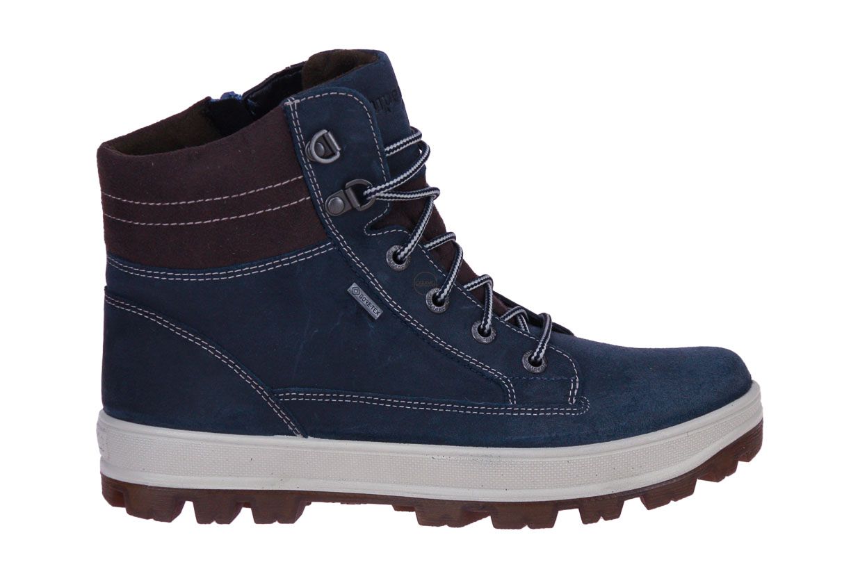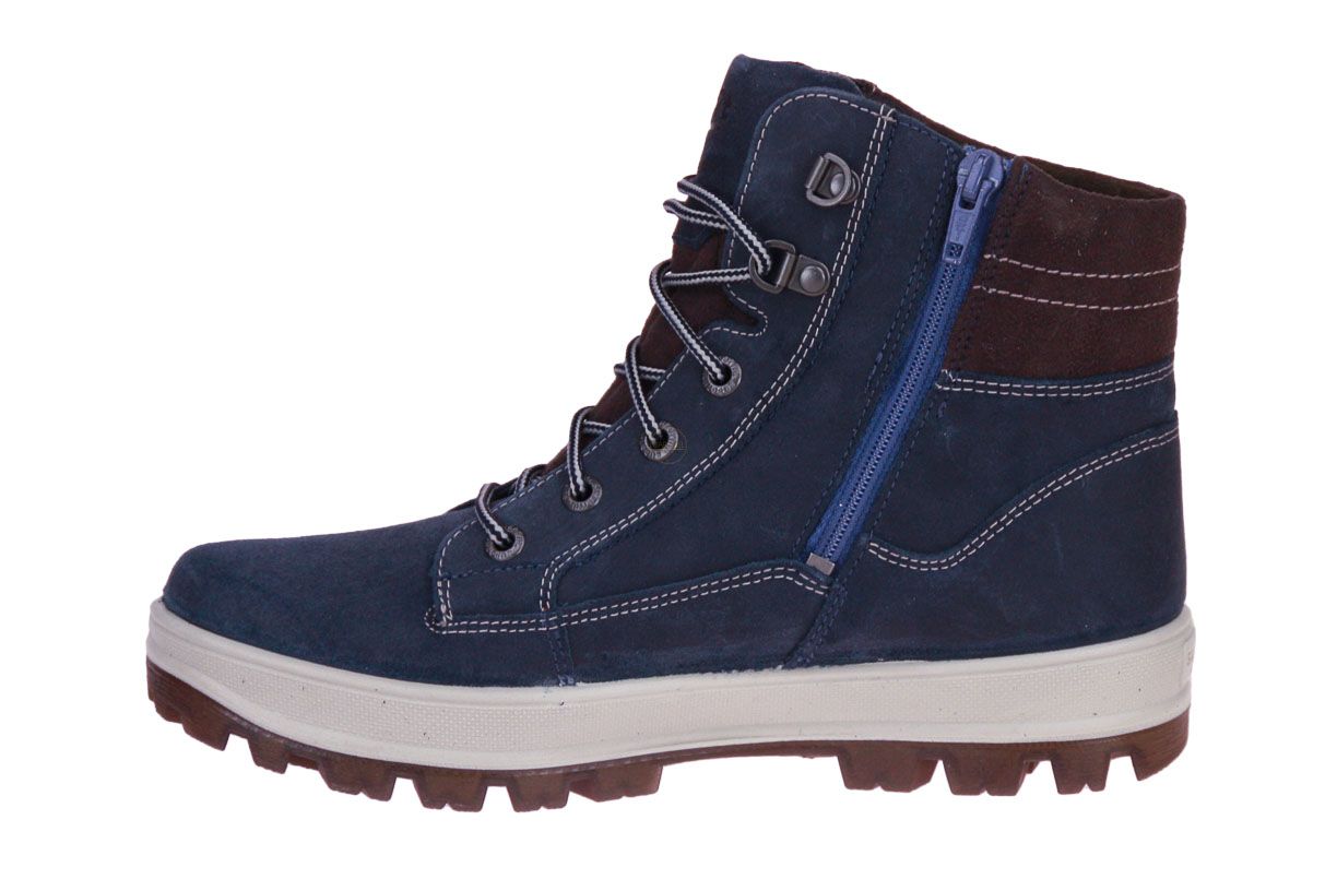 Blauw suede kinderbottine van het merk Superfit. De binnenzool is uitneembaar, ideaal voor steunzolen.