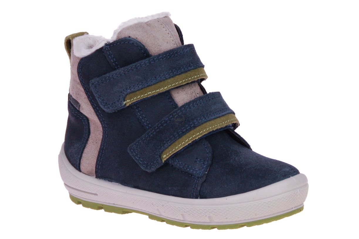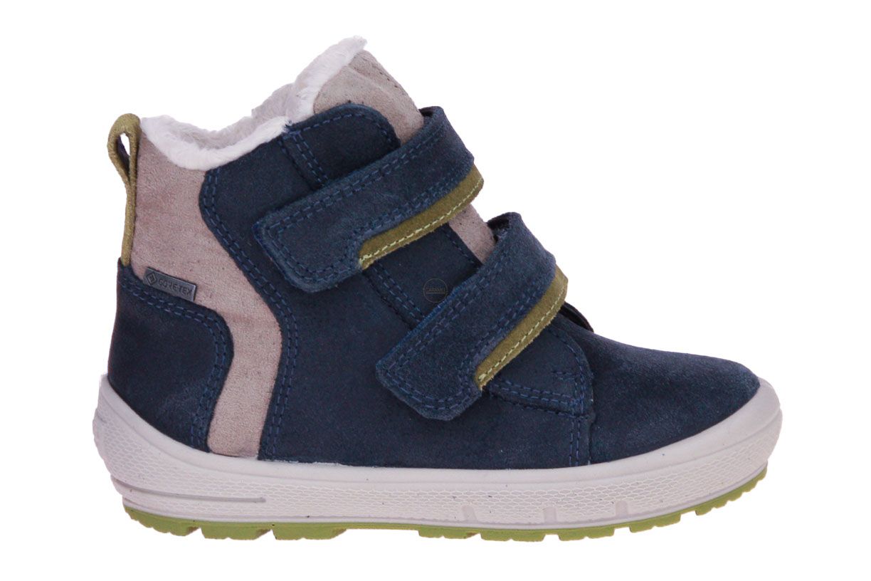 Blauw suede kinderschoen met grijze accenten van het merk Superfit. De binnenzool is uitneembaar, ideaal voor steunzolen.