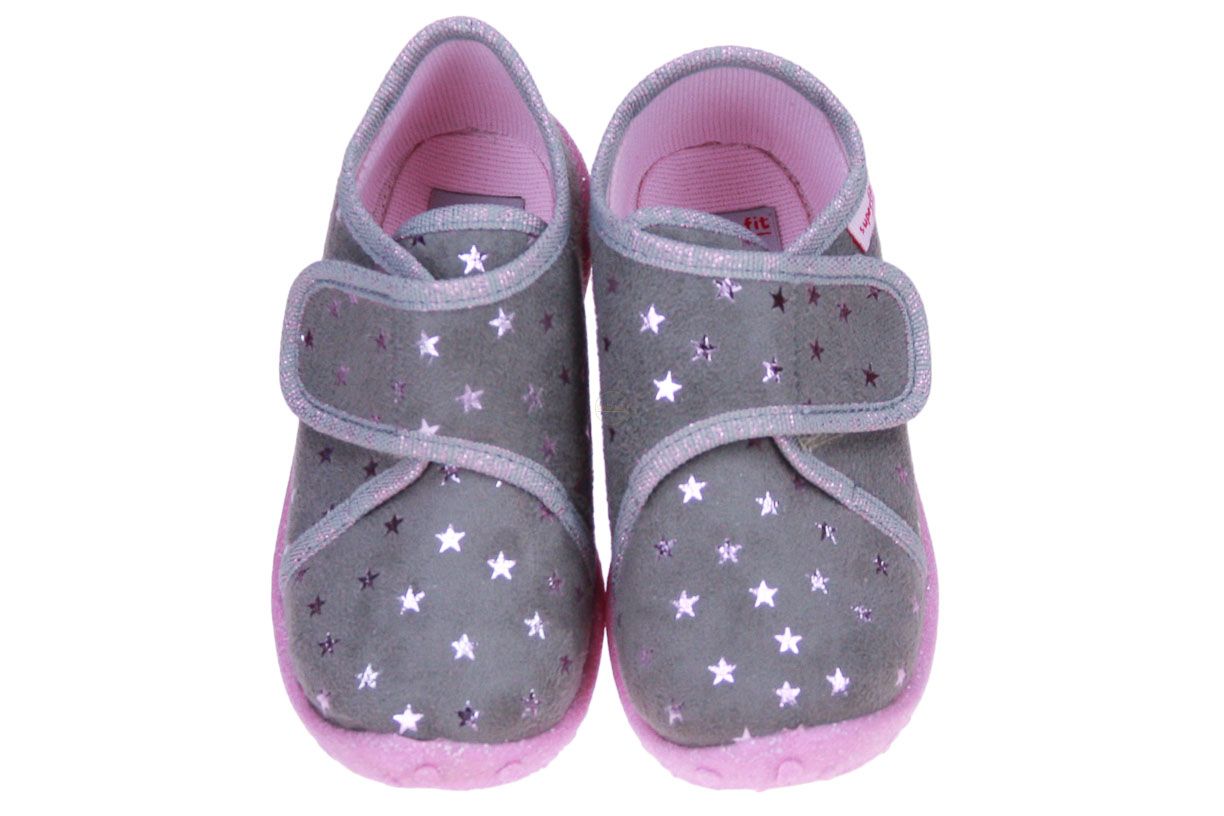 Grijs textielen meisjespantoffel met roze sterretjes van het merk Superfit.
